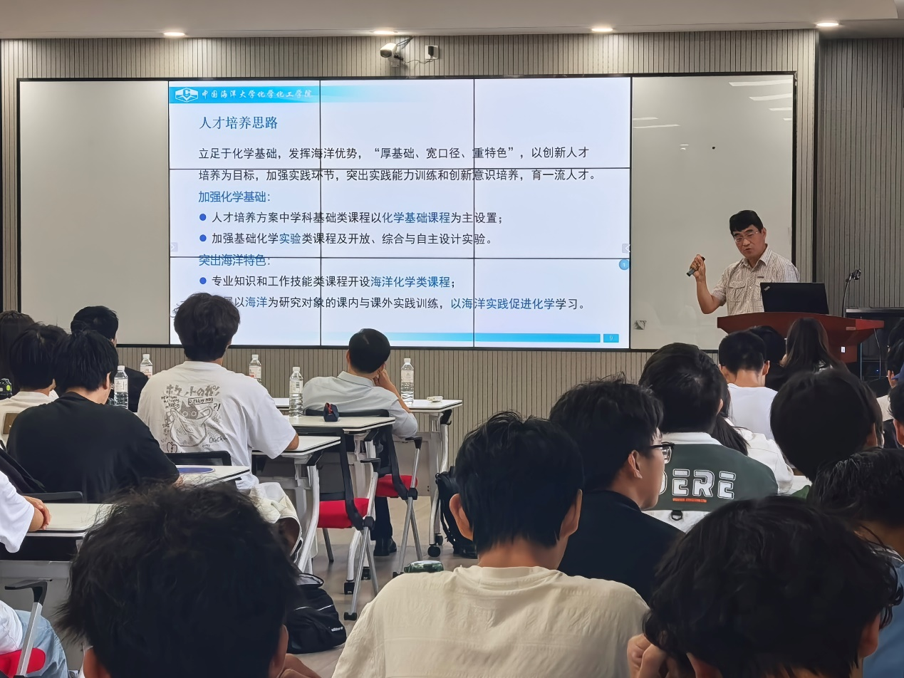 为进一步提升优秀本科生培养质量,化学(海洋化学)国家理科基础科学研究和教学人才培养基地班于2025年10月9日下午在化学楼学术报告厅举行师生交流会。化学化工学院副院长庄光超教授、海化系主任刘春颖教授、海化系副主任许博超教授、肖晓彤教授、张洪海教授以及全体2024级化学专业本科生出席。