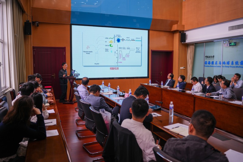 2025年10月13日上午,由中国海洋大学海洋化学理论与工程技术教育部重点实验室/化学化工学院主办的“实学讲堂”第四期活动在中国海洋大学海洋科技大楼前沿报告厅举行。本次活动邀请到中国科学院院士、上海交通大学樊春海讲席教授作题为《核酸信息材料》的学术报告。校内外百余位师生代表齐聚一堂,共同聆听了这场学术盛宴。活动现场座无虚席,学术氛围浓厚。讲座现场 本次报告由中国海洋大学海洋化学理论与工程技术教育部重点实验室许博超教授主持。樊春海院士在报告中系统介绍了核酸框架结构的特点及其在纳米机器人和DNA存储等中的应用,并在互动交流环节回答了与会师生关于DNA与化学材料区别、作为药物载体的应用潜力等的相关问题。樊春海院士作讲座现场交流讨论 座谈交流结束后,李召斌书记向樊春海院士颁发了“实学讲堂”证书。李先国院长在总结发言中,感谢了樊春海院士带来的精彩报告,指出报告内容学科交叉强、深入浅出、启发性强,鼓励广大师生在平常科研中加强学科交叉、勇于探索、积极创新,不断提高科研能力和学术水平。讲座证书颁发李先国院长总结通讯:李雁宾林翰